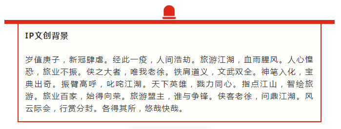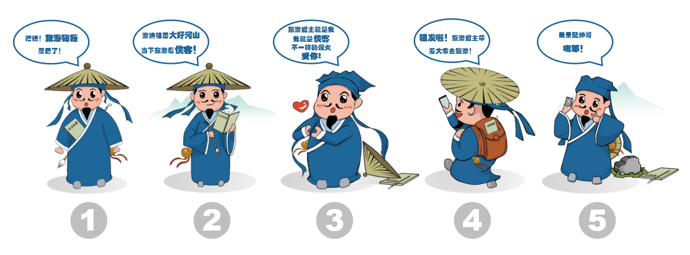 为了让徐侠客的形象更有趣,我们做了不同的主题表现,每一个主题都突出老徐的个性,传达出徐侠客随性自由、具有活力勇于探险新事物的生活方式,未来将借助老徐的形象,和各位少侠一起仗剑行走江湖!一起领略旅游江湖的风云变幻。